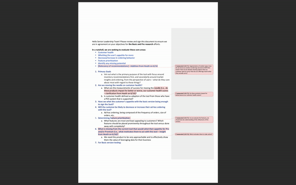 Please note: the annotations are from product managers and senior-level stakeholders to align business interests and goals. This document has been blurred to protect anonymity.