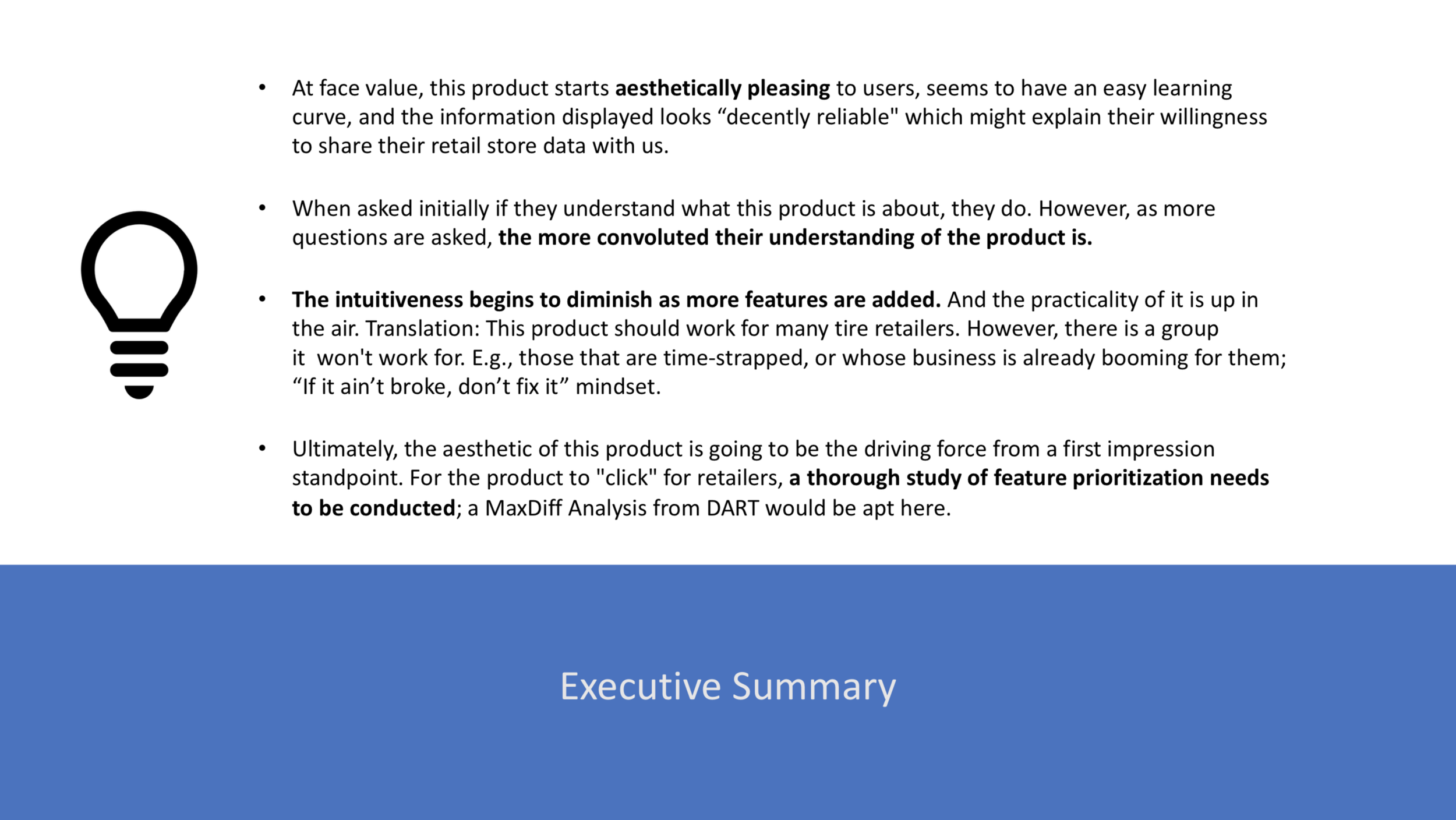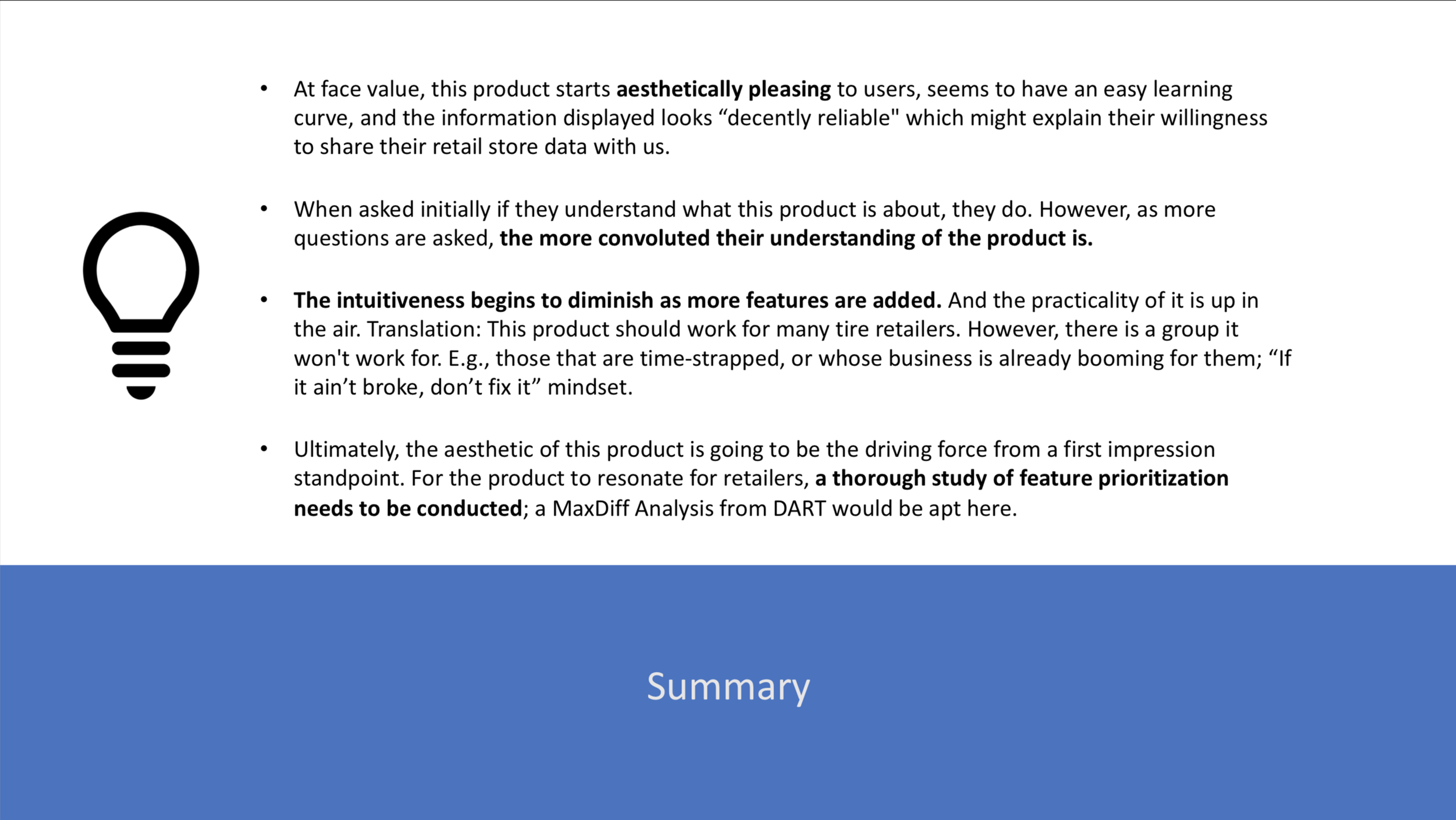 Here is an example of how I gathered and summarized stakeholder requirements; a vital step that should precede each phase of product development: